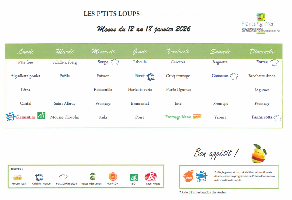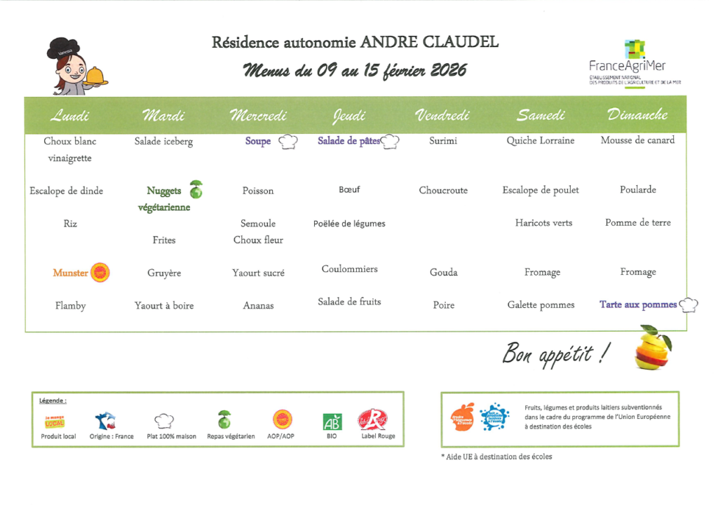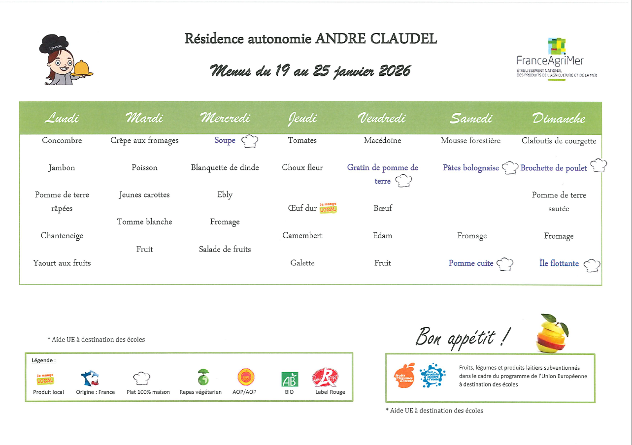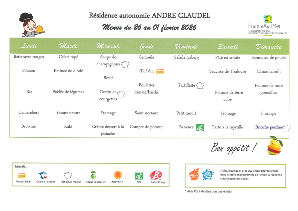 Les repas sont préparés par la résidence autonomie André Claudel. Nous sommes vigilants à les adapter aux besoins et goûts des enfants.